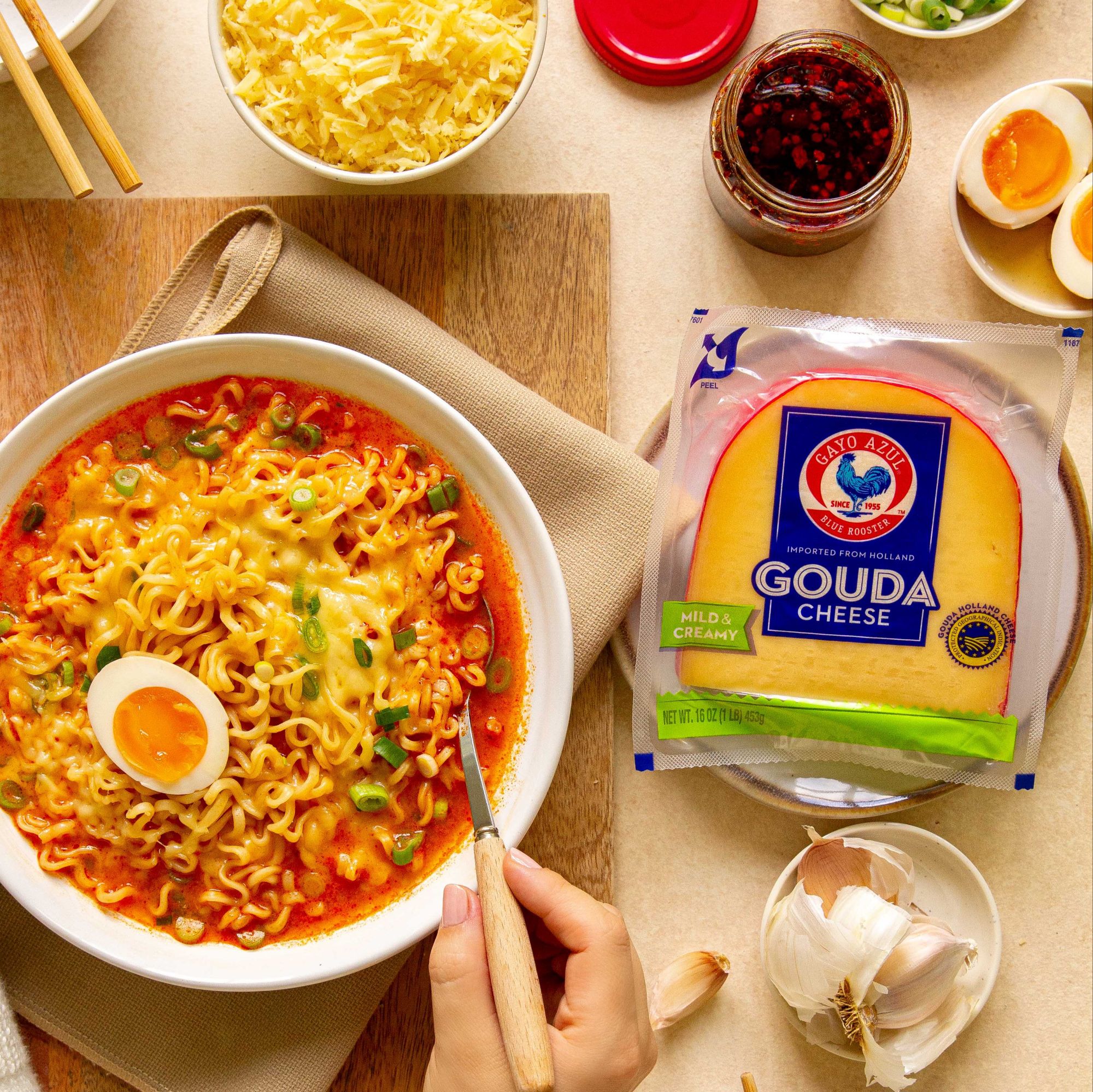 The beauty of cooking with cheese like this is that it does the heavy lifting without announcing itself. A fondue that draws everyone around the pot. A frittata that works as well at a brunch table as it does cold out of the fridge the next morning. A bowl of ramen that goes from late-night impulse to something genuinely satisfying just by adding a handful of grated Gouda.