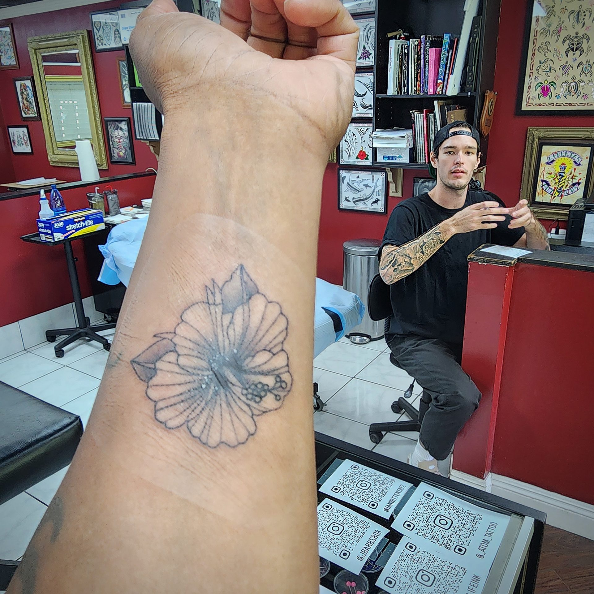 Vaughn Lowery gets Hawaii’s Hibiscus state flower tattooed on by Ian Witten of Victorian Tattoo Honolulu via 360 MAGAZINE on Toyota Grand Highlander drive at Mauna Lani Resort.
